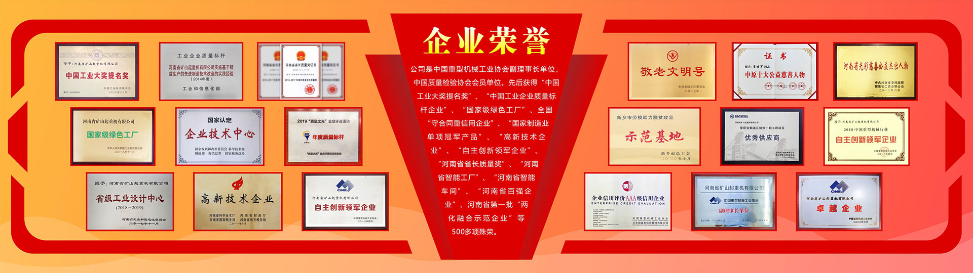 河南礦山成立于2002年,公司注冊(cè)資金11.77億元,建設(shè)面積162萬(wàn)平方米,現(xiàn)有員工4500余人,擁有各類(lèi)先進(jìn)加工設(shè)備3500余臺(tái)(套)。專(zhuān)注從事“礦源”牌橋式起重機(jī)、門(mén)式起重機(jī)及電動(dòng)葫蘆等三大系列110余種各類(lèi)起重機(jī)及配套件產(chǎn)品的研發(fā)、生產(chǎn)、銷(xiāo)售及服務(wù)。作為一家起重機(jī)及物料搬運(yùn)產(chǎn)品制造商和服務(wù)供應(yīng)商,能夠?yàn)榭蛻?hù)提供整體解決方案和全生命周期服務(wù),致力于起重機(jī)產(chǎn)業(yè)的智能、綠色、高質(zhì)量發(fā)展?! 」臼侵袊?guó)重型機(jī)械工業(yè)協(xié)會(huì)副理事長(zhǎng)單位,中國(guó)質(zhì)量檢驗(yàn)協(xié)會(huì)會(huì)員單位。先后獲得“中國(guó)工業(yè)大獎(jiǎng)提名獎(jiǎng)”、全國(guó)“守合同重信用企業(yè)”、“河南省省長(zhǎng)質(zhì)量獎(jiǎng)”、“河南省智能工廠(chǎng)”、“河南省智能車(chē)間”、“河南省百?gòu)?qiáng)企業(yè)”等500多項(xiàng)殊榮。產(chǎn)品產(chǎn)銷(xiāo)量、市場(chǎng)占有率、自動(dòng)化智能化裝備水平連續(xù)多年位居全國(guó)同行業(yè)前?! ?021年單、雙梁各類(lèi)起重設(shè)備產(chǎn)銷(xiāo)量近10萬(wàn)臺(tái)(套),銷(xiāo)售額達(dá)74億元,納稅2.23億元。公司擁有428家銷(xiāo)售服務(wù)機(jī)構(gòu)遍及全國(guó)各地,服務(wù)于7000余家中高端客戶(hù),在航空航天、汽車(chē)船舶、鋼鐵冶煉、石油化工、電子信息、電業(yè)水利、鐵路軍工等50多個(gè)行業(yè)領(lǐng)域取得驕人業(yè)績(jī)。研制開(kāi)發(fā)的智能倉(cāng)儲(chǔ)起重機(jī)、精準(zhǔn)定位起重機(jī)、自動(dòng)化集裝箱門(mén)式起重機(jī)、核級(jí)專(zhuān)用起重機(jī)、潔凈防爆自動(dòng)起重機(jī)、多支點(diǎn)柔性起重機(jī)、模擬海事救援起重機(jī)等高精尖產(chǎn)品服務(wù)于寶鋼、中鐵、中冶、中核、中航等大型企業(yè)。產(chǎn)品覆蓋80多個(gè)國(guó)家和地區(qū)?! 」疽浴靶⑽幕睘槠髽I(yè)文化的核心價(jià)值觀(guān),以誠(chéng)信贏(yíng)天下,與各界朋友合作共榮,致力于起重機(jī)產(chǎn)業(yè)高質(zhì)量發(fā)展。 [了解詳情]